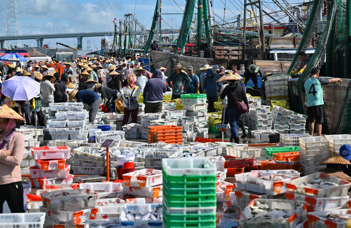 8月21日,在海南省文昌市清澜渔港码头,渔民和商贩在卸货、交易。8月16日南海伏季休渔期结束后,海南出海渔船已陆续满载而归,丰收的喜悦溢满码头,大批新鲜海产品源源不断供应市场。