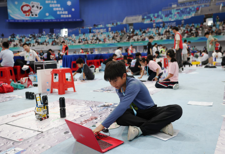 8月21日,参赛选手在2025 Botball国际教育机器人大会比赛中。8月21日,2025 Botball国际教育机器人大会在国家速滑馆开幕。来自中国、美国、马来西亚、泰国、奥地利、斯洛伐克等10余个国家及地区的近1500名青少年科创爱好者参与其中。