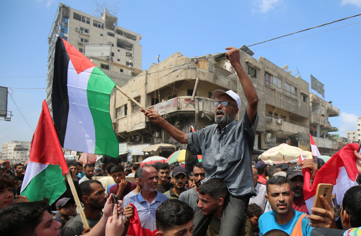 8月21日,数百名巴勒斯坦人聚集在加沙城的市中心,要求以色列停止战争和驱逐平民,呼吁国际社会保护加沙平民。
