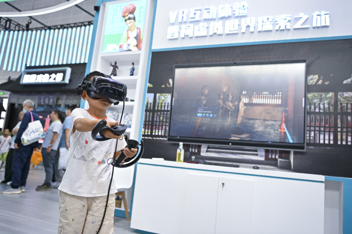 8月21日,一位小朋友在第七届山西文化产业博览交易会上通过VR设备游览晋祠。8月21日,第七届山西文化产业博览交易会(简称“文博会”)在太原开幕。本届文博会将持续至8月25日,将有来自全球30多个国家的近2000家企业参展。