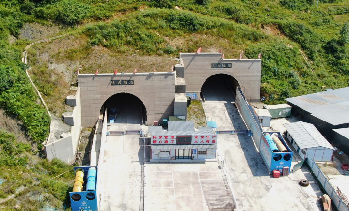 空中俯瞰西昭高速洛古隧道口(8月21日摄,无人机照片)。8月21日,由中铁十局承建的西昭高速洛古隧道全线贯通,洛古隧道左线长6570米,右线长6661米。西昭高速公路西起四川省西昌市,东至云南省昭通市,是国家高速公路网中都匀至香格里拉高速公路的重要组成路段,也是四川省凉山彝族自治州打通对外通道的核心经济干线。